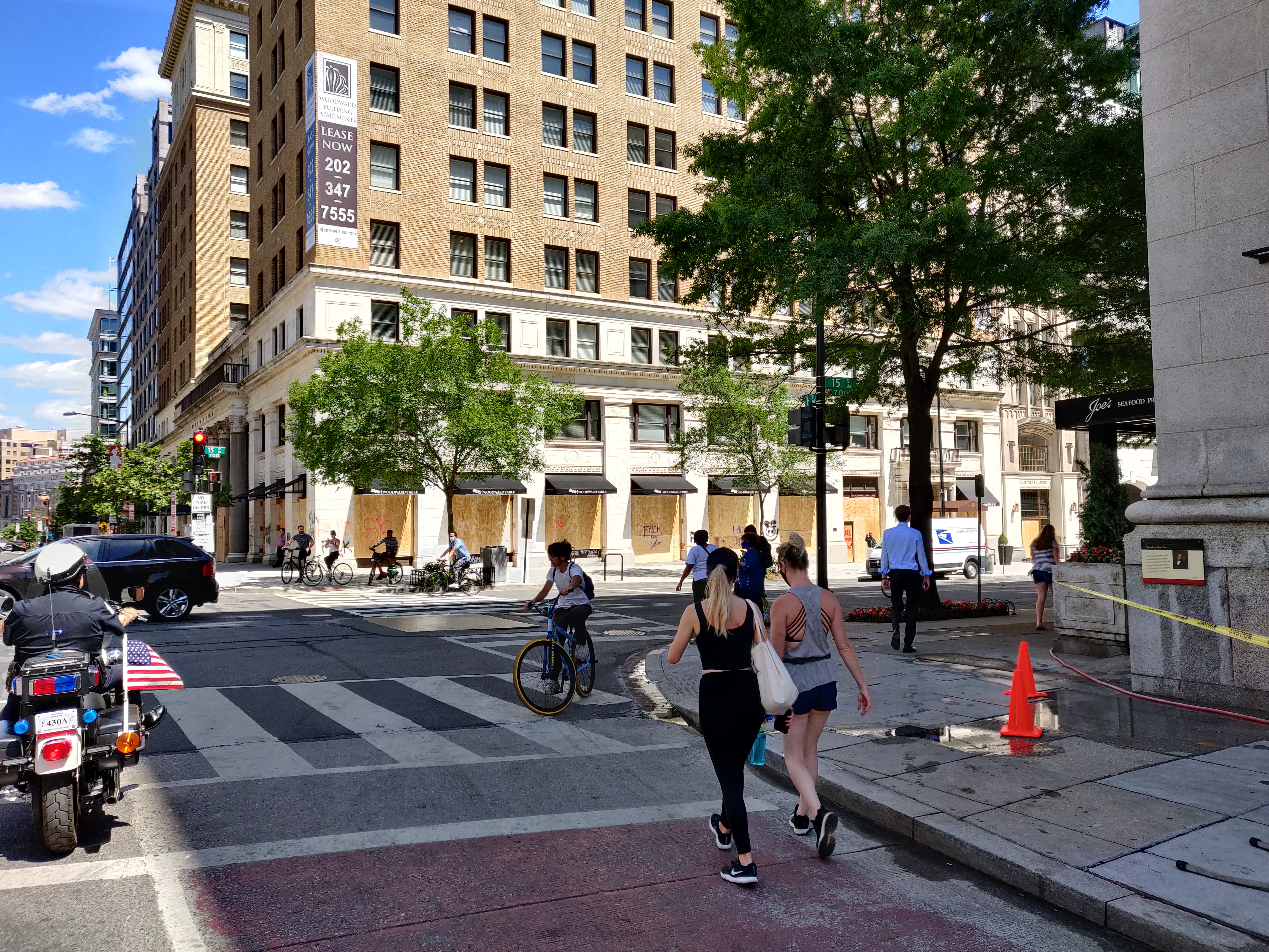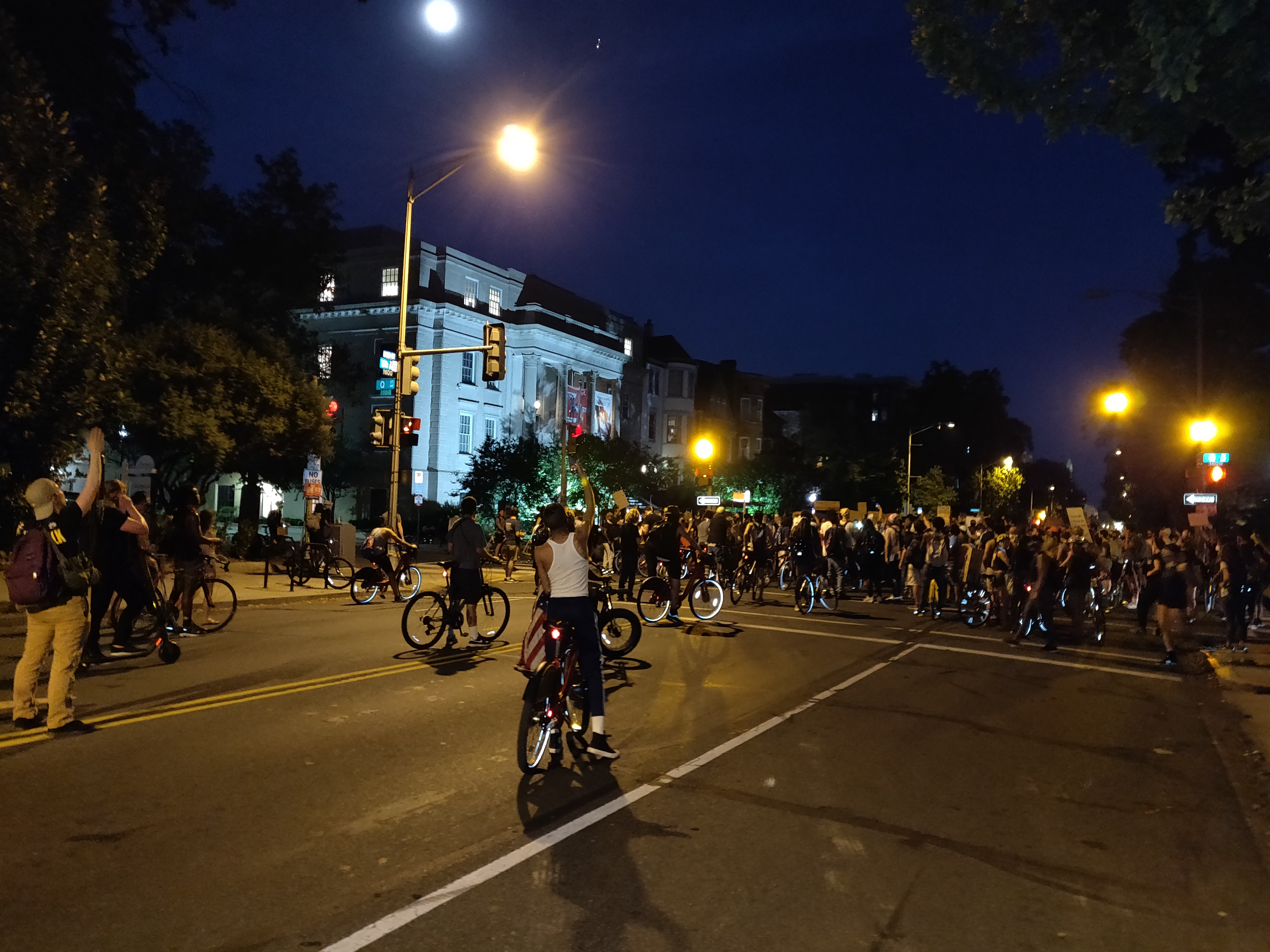 The policing relaxed after the first few nights, but it didn't completely go away. I remember biking through the city one evening when I stumbled upon a large crowd of peaceful protesters near Thomas Circle. As usual, people were holding signs and chanting. Occasionally, groups of people would kneel in silence for 8 minutes and 46 seconds as a tribute to George Floyd. Let me tell you: it's not easy to kneel on a street for that long! Just imagine if you were the one laying on the street with somebody kneeling on your neck for even just 30 seconds. The final moments of George Floyd's life must have been truly awful.
